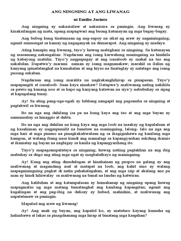 Ang Ningning at ang Liwanag Ang Kalayaan Ang Taoy Magkakapantay Ang Pag-ibig Mga Bayan at mga Pinuno. Ang Liwanag at Dilim ni Emilio Jacinto. Tagos sa puso ang bawat salitang ginagamit ng may akda na iiwan ng kakintalan sa puso at isip.