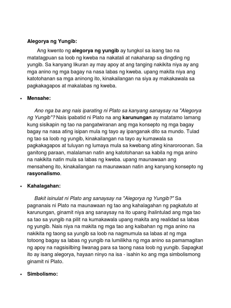 Buod ng sanaysay na alegorya ng yungib. Buod ng Alegorya Ng Yungib. Enrijo a Mabisang Panimula 1. Ang layunin nito ay para makita natin ang kahirapan o suliranin na ginawa ng mga tao sa sanlibutan papunta sa liwanag.
