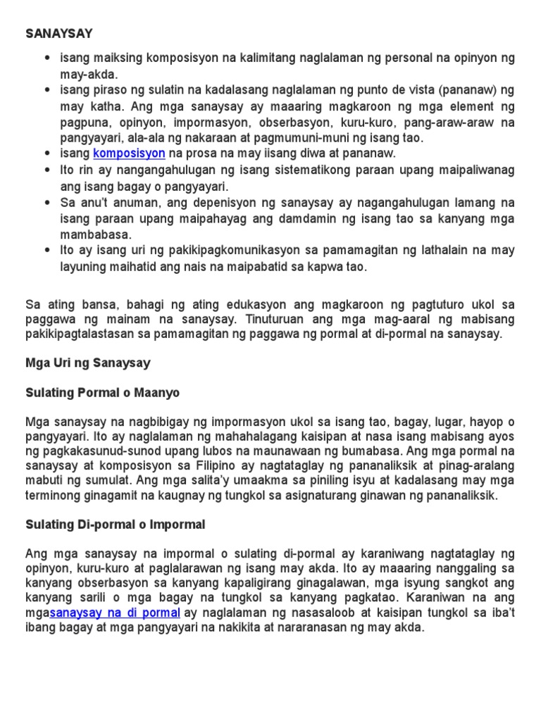 Halimbawa Ng Sanaysay Na Pormal Maikli